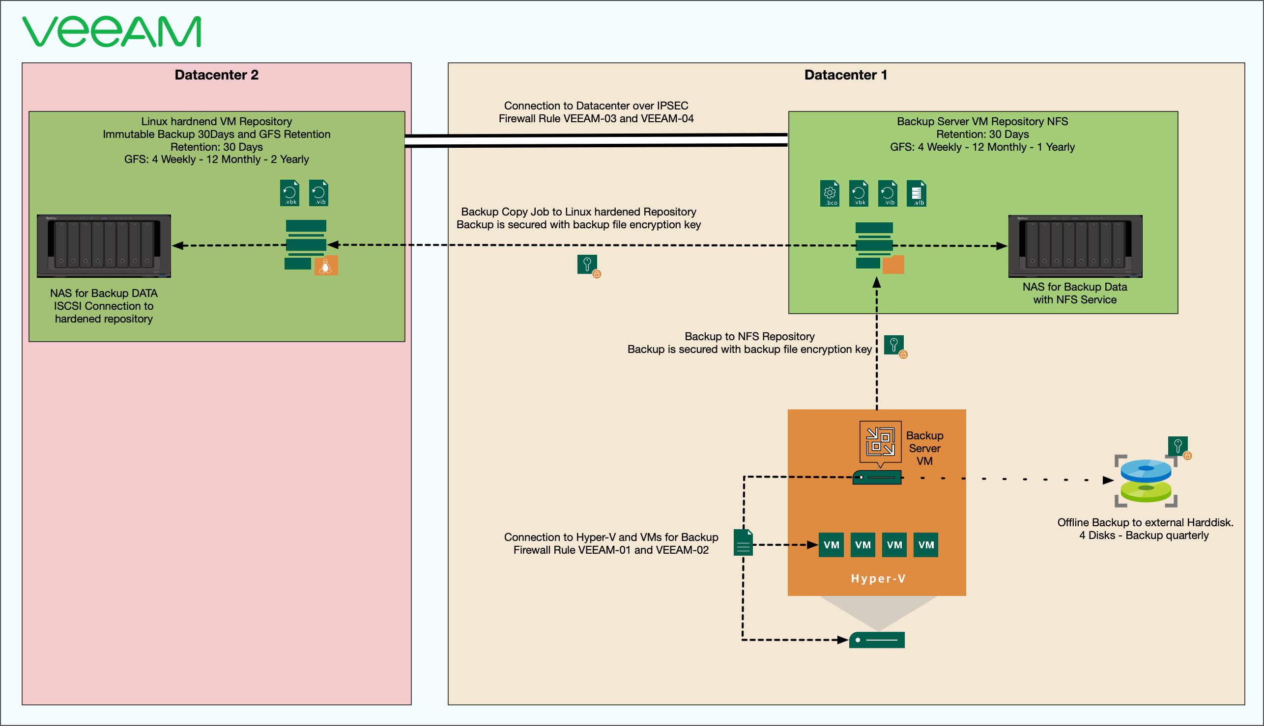 Two Different Media Types: Utilize various storage media such as NFS-connected NAS in Datacenter 1, iSCSI-connected NAS and Linux hardened repository in Datacenter 2, and additional external hard disks.